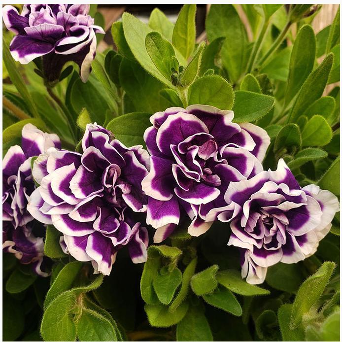 Fully double petunias with fringed flowers and beautiful white and purple picotee patterns. the Pirouettes are known for their 7.5-10 cm (3-4") blooms. Excellent annual plants suited for most locations they continue to be a popular choice for bedding plants. containers and hanging baskets. Their compact upright habit further showcases these terrific bi-color flowers.