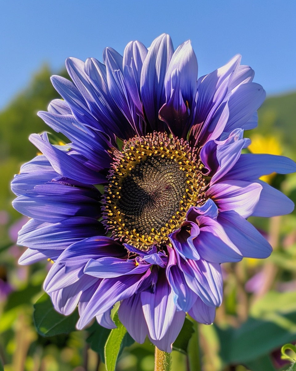 A breathtaking field of sunflowers featuring vibrant purple petals. creating a stunning contrast against the bright blue sky and lush green landscape. This unusual and captivating color variation turns a typical sunflower field into a mesmerizing spectacle of color and beauty.