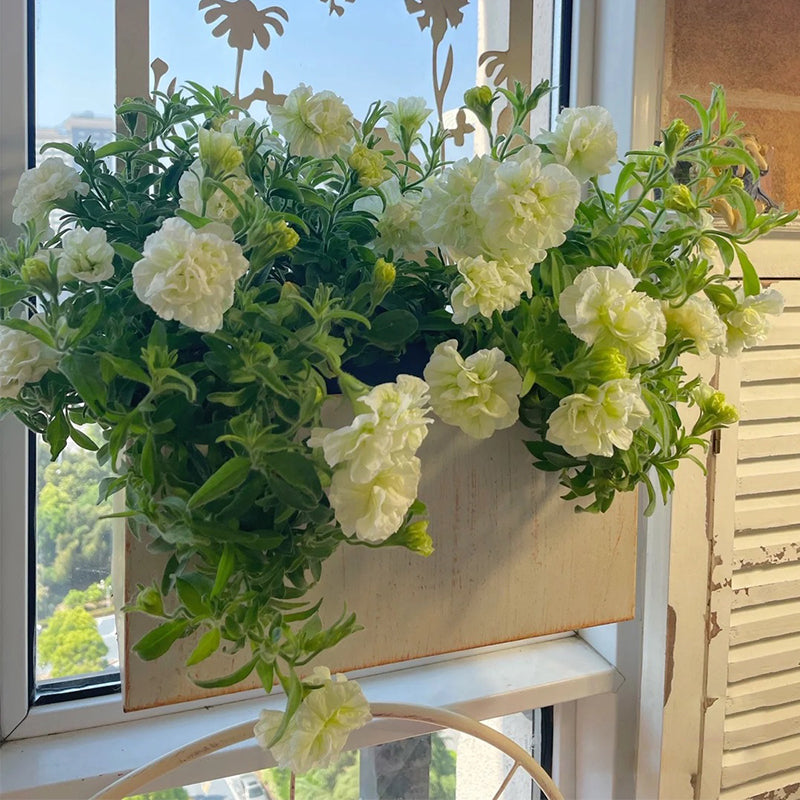Beautiful tender flowering plant with creeping shoots grows 50-70 cm (20-30 in.) long. Funnel-shaped and frilly. snow-white flowers. diameter 7-9 cm (3-3.5 in.) which covers the plant completely during the flowering. Blooms from June to late autumn. Use for balconies. garden vases. hanging pots. and balcony containers.